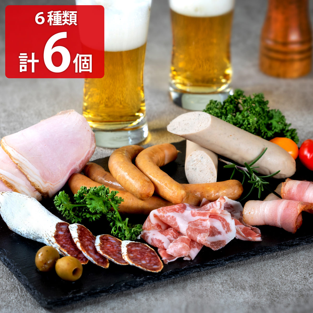 【数量・内容】粉雪サラミ45g、乾塩仕込み生ハムコッパ30g、ロースハムスライス66g、あらびきウィンナー120g、ドイツ屋台の白い焼きソーセージ100g、燻しベーコンステーキ45g