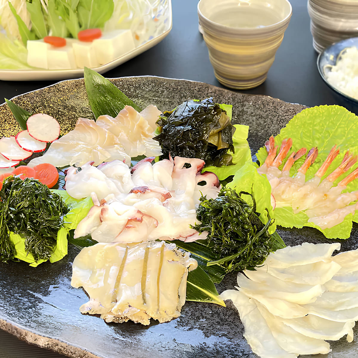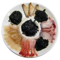 【原材料】【冷しゃぶ】水だこ(新潟県)、標準和名ゴマフグ(新潟県)、真鯛(新潟県)、ぎんば藻(新潟県)、わかめ(新潟県)、甘海老(新潟県)、鮑(新潟県)