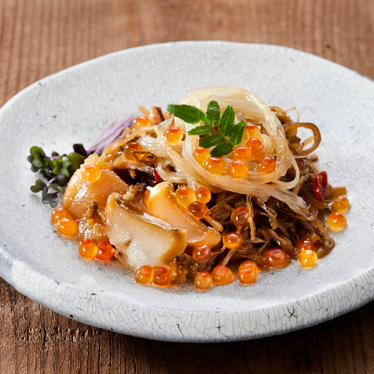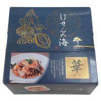 特製の松前漬をベースに国産いくら、国産のあわび、ふかひれを盛り付けた「海鮮漬 けせんの海 金印」です。従来の松前漬をお客様のお声を参考に試行錯誤を重ね改良しました。子供から大人まで召し上がってもらえるように、やさしい味付けに仕上げています。見た目にも華やかな海鮮漬をぜひご賞味ください。