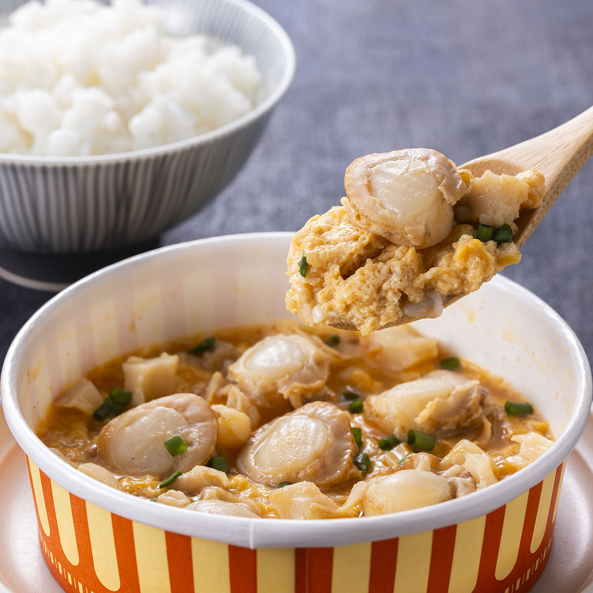 「青森ほたて 貝焼きみそ」は、具材を卵でとじて食べる青森県の郷土料理です。本来はほたての貝殻を器のように使いますが、本品ではカップを採用しており、電子レンジで温めるだけで食べられます。ベビーホタテ5〜6粒に加え、カットホタテも入っておりホタテ感満載です。