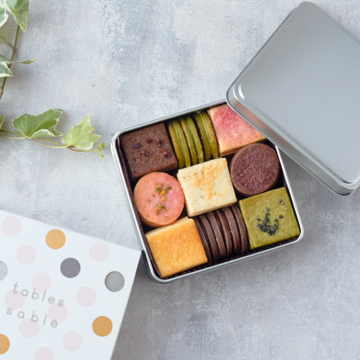 「TABLES キャラメル サブレ フレーバー 9種」はひと口サイズのタブレスサブレをセットにした焼き菓子詰め合わせです。クリームをサンドしたものやトッピングして焼いたものなど、サクサクの食感がたまらないです。イチゴキャラメルのような甘いものから、エダムチーズとこしょうを合わせた甘じょっぱいおつまみ系まで、9種類の味が楽しめます。