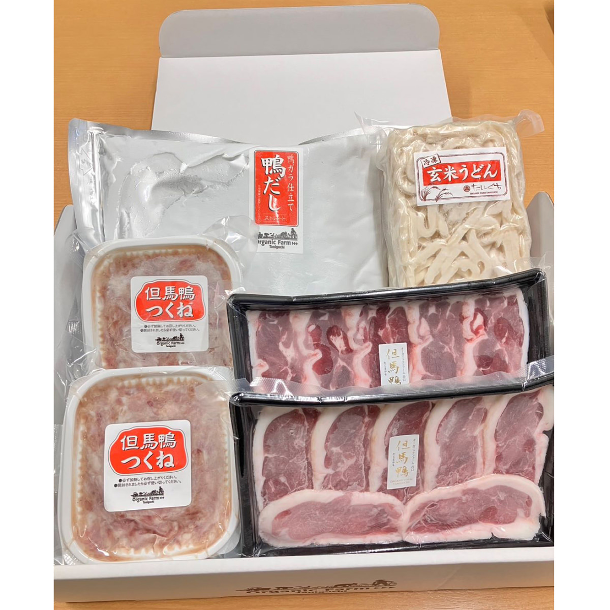 【数量・内容】但馬鴨肉スライス100g×2、但馬鴨つくね100g×2、鴨だし1000ml×1、玄米うどん400g×1