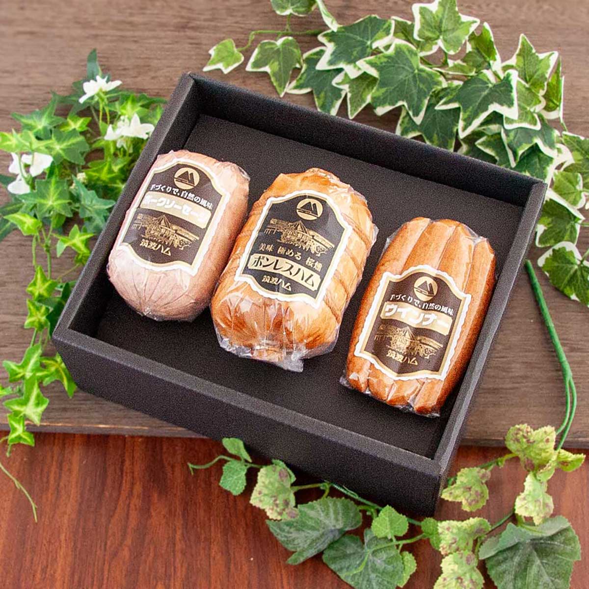 「筑波ハム ギフト 詰め合わせ」は、しっとりとした味わいのボンレスハム、ポークソーセージ、定番のウインナーのセットです。いずれも茨城県産ブランド豚「常陸の輝き」を贅沢に使用。筑波ハム自慢の職人の技が光る燻煙技術をご堪能ください。お中元やお歳暮、内祝などの贈り物シーンにおすすめです。