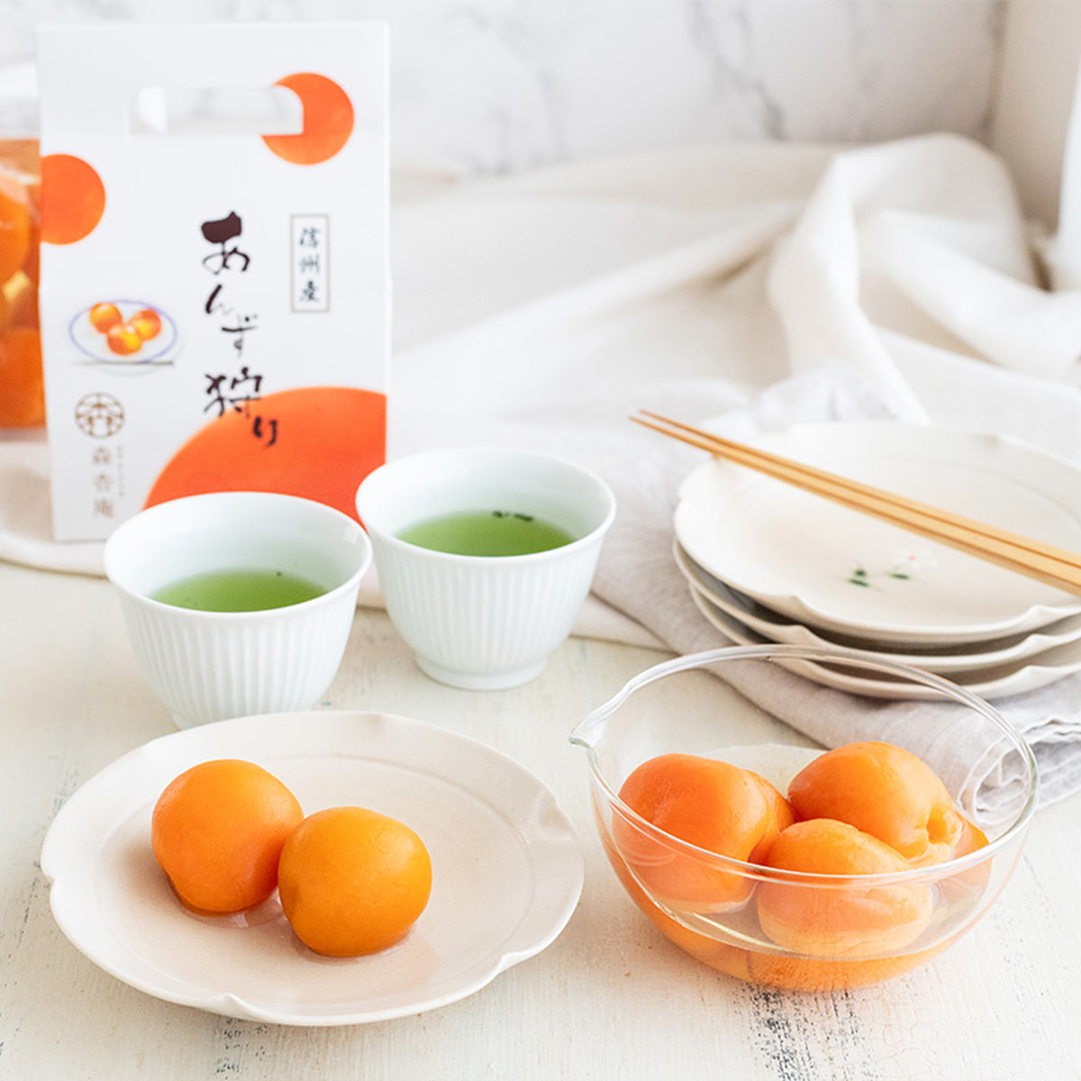 森杏庵(しんきょうあん)のあんず狩りは、地域で伝えられてきた焼酎と塩を聞かせた伝統の味を再現しております。時代を超えて親しみを感じる味わいになっております。おやつ、お茶請け、デザートなどとして、お取り寄せでお楽しみください。シンプルに冷やしてお召し上がりいただくのがおすすめです。