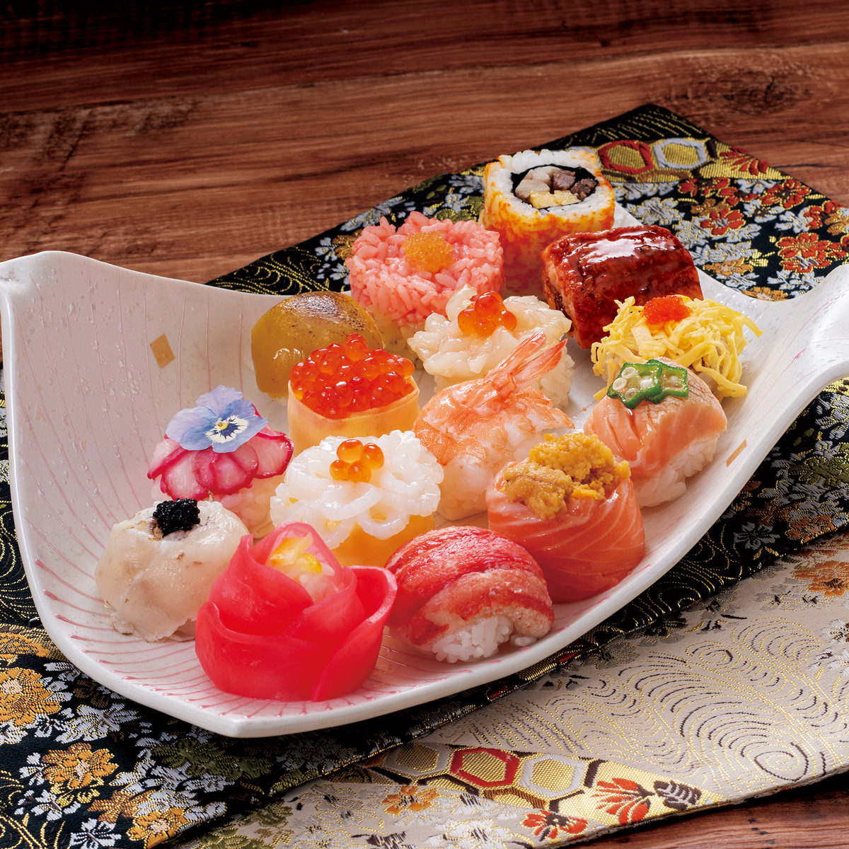 【数量・内容】15個(蕪花手毬、明太高菜手毬、スイートポテト手毬、フグ手毬、うなぎ手毬、ラディッシュ華てまり、いくら錦糸巻、イカ菊花手毬、帆立菊花手毬、海老手毬、生うにトロサーモン巻、本ずわい手毬、穴子たまご手毬、プルコギロール、トロはらすサーモン手毬)