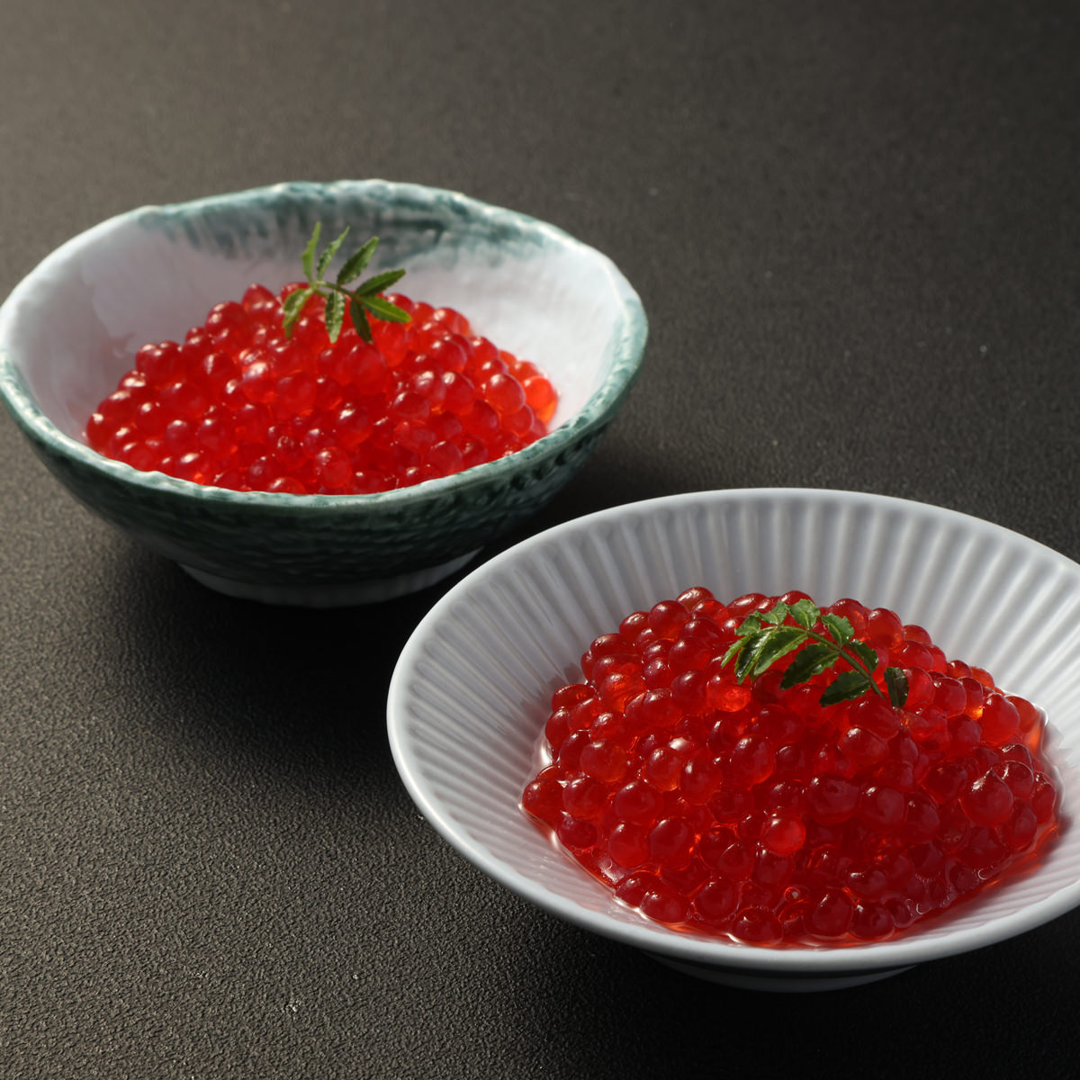 <醤油漬け>淡口醤油(本醸造・国内製造)、こんぶ出汁、グラニュー糖、海苔エキス、亜麻仁油、調味料(アミノ酸等)、塩/ゲル化剤(乳酸Ca、アルギン酸Na)、増粘安定剤(タラガム、CMC、グアーガム、アカシアガム、ペクチン)、着色料(βカロチン、赤色40)、保存料(グレープフルーツ種子抽出物)、(原料の一部に小麦・大豆を含む)