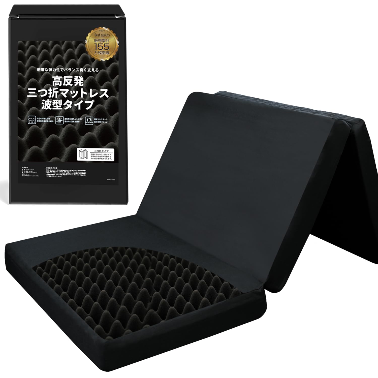 【サイズ】シングル/約95x195x10cm【仕様】三つ折極厚タイプ【硬さ】程よい硬さの150N【カラー】ブラック【素材】中材:特殊凹凸カッティング竹炭配合高反発ウレタンフォーム、カバー:伸びにくい布帛生地