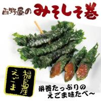 ●みそしそ巻き(えごま) いわき産の玄米みそにえごまたっぷり練り込み、しその葉に巻いて揚げました。 西野屋オリジナルのみそしそ巻きです。