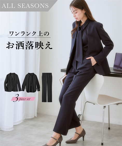 【素材】品質=[表地]ポリエステル100% [裏地]有(ジャケット:背抜き)ブラウス・パンツ無 ジャケット:肩パッド有(取外し不可) 前ホック開 ポケット前2・左内 袖口ベンツ 後ベンツブラウス:袖口ボタン開 両脇スリットパンツ:前ホック付ファスナー開 ウエスト後ゴム入 ポケット両脇・後飾り ※この商品は3点同サイズでのみ販売します。<洗濯方法>洗濯機OK ネット使用