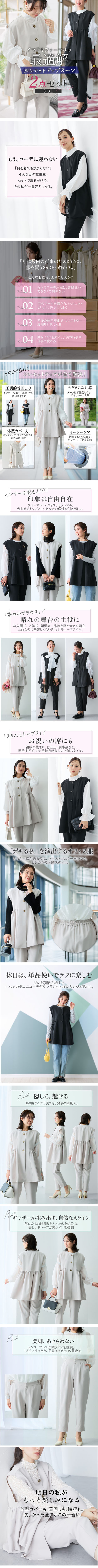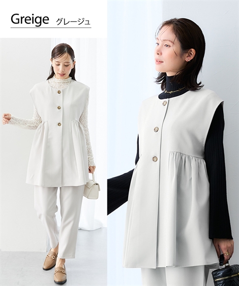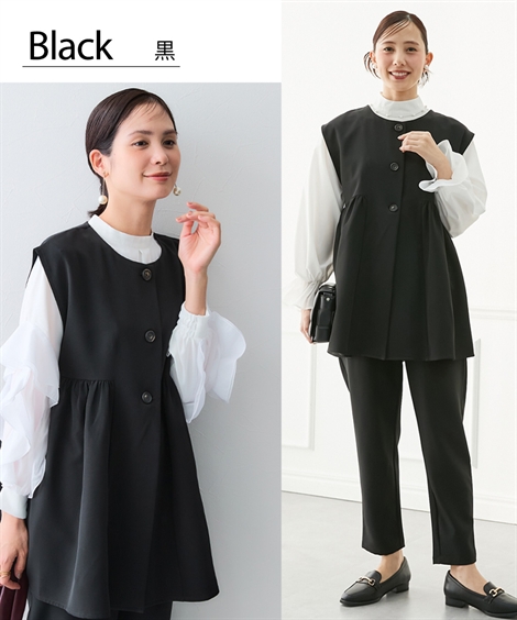 【素材】品質=ポリエステル95%・ポリウレタン5% ジレ:前ボタン開 パンツ:前ホック内スナップボタン付ファスナー開 ポケット両脇 ※この商品は2点同サイズのみで販売します。 洗濯機OK ネット使用