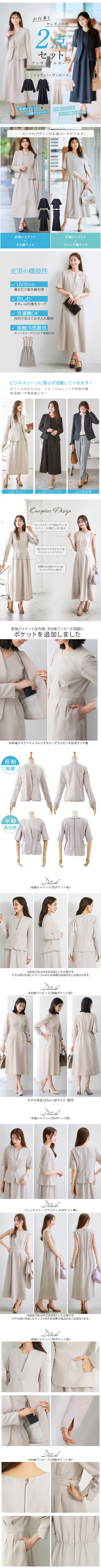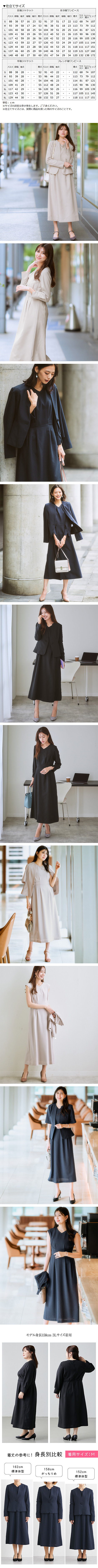 【素材】【長袖ジャケット+8分袖ワンピース】品質=[表地]ポリエステル100%(織物) ジャケット:肩パッド無 前ボタン開 袖口スリット ポケット両脇 内ポケット付 ワンピース:後ホック付ファスナー開 ウエスト後ゴム入 袖口スリット【半袖ジャケット+フレンチスリーブワンピース】品質=[表地]ポリエステル100%(織物、マット) [裏地]有(ジャケット:無 ワンピース:スカート部) ジャケット:肩パッド