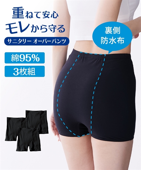 多い日に、夜の寝る時に、サニタリーショーツの上から重ねばきで安心できるサニタリー用のオーバーパンツです。透湿性のよい日本製の防水布を使用しているので、ムレにくく、快適です。さらに防水布には抗菌防臭加工があるので、気になるニオイを軽減します。従来より防水布の伸縮性がアップしました。