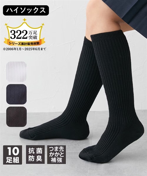 コメント累計販売枚数313万足突破 ニッセンオリジナル 抗菌防臭 しっかり丈夫な無地スクールハイソックス10足組 ●丈夫なヒミツは糸の本数!● 通常のソックスの1.3倍の特別な編立てをしています。 丈夫さに自信あり! ~その他6つのポイント~ ■抗菌防臭加工 毎日汗をかいて活発に活動してもニオイが気になりにくいです。 ■つま先かかと補強設計 足の負荷かかかりやすいので補強編みをしています。 だから丈夫さ抜群です ■抜群のフィット感 伸縮性があり、長時間はいても快適なはき心地です。 足口はズレにくいリブ仕様です。 ■さらりとした綿混素材 綿を使った靴下ならではのやさしいはき心地です。 通気性がよく、普段使いにもぴったりです。 ■同色10足組 洗い替えや長期の旅行や合宿にも対応できます。 ■成長に合わせて選べる4サイズ 足の大きさが16cmから26cmまで対応できるので、幼児のお子様から中高生のお子様までご着用いただけます。 一度気にいっていただけると長くご着用いただけます。 同シリーズのクルー丈ソックスも取り扱っております。