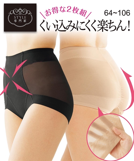 ヒップもお腹もキュッと引き締めながら、ウエスト前中央部や脚口(マチ部除く)は折り返し仕様。ゴムが直接肌にあたらないからラクなはき心地です。身生地は爽やかな透け感がありながらパワーのあるネット素材で暑い季節も快適。洗い替えに便利な2枚組