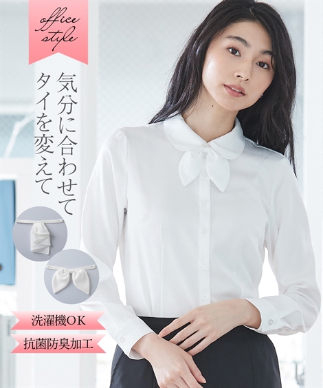 ☆制服スタイルの女子力を後押しする、フリルタイとリボンタイが付いたシャツ☆・上品な光沢があり、肌触りもよいパウダーサテン素材のシャツ。・女性らしい丸みのある衿に2種類のタイを付け替えできるデザイン。・リボンタイ・フリルタイが胸元を華やかに演出します。・洗濯機で洗濯できるのでヘビロテ可能です。・抗菌防臭加工付きで胸元がちら見えしないように付いた隠しボタンも嬉しいポイント。