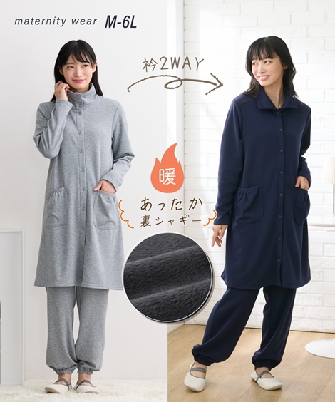 ふんわり柔らかくて、しっかりとした厚みのある裏シャギー素材のあったかパジャマです。 トップスは前を閉じてパジャマとしてはもちろん、前を開けてガウンとしても使えます。 衿部分は、寒い時はボタンを全部閉めてハイネックとして、あったかい時は上のボタンを外して衿タイプにもなる2WAY仕様。 スマホなど、ちょっとしたものを入れられるポケットもついていて便利です。 前開きの胸部分はスナップボタンになっているので、赤ちゃんを抱っこしたまま片手で簡単に外せるようになっています。 前開き授乳タイプなので、産後、授乳期以降もパジャマとして使いやすいです。 パンツはボタン付きのゴム仕様でウエスト調節ができます。 ウエストの調節口は肌側外側にあるので、調節しやすく、ボタンが当たらずゴロゴロしにくい ・産前から産後に使う ・トップス:授乳機能付(前ボタン) ・パンツ:ウエスト調節可 ・冬素材