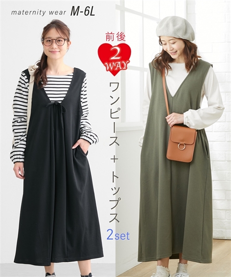 【コメント】前後2WAYで着こなし2倍のジャンパースカートとトップスがセットになった 着こなしの幅が広がる2点セットです ■design ・ジャンパースカートは前後2WAYで着られて、前と後でまったく違う表情が楽しめます リボンを前にして着るとちょっぴり大人かわいい雰囲気に リボンを後ろにして着るとすっきりした印象ながら後ろ姿に華があるデザインになっています ・トップスの袖口はゴムで少し