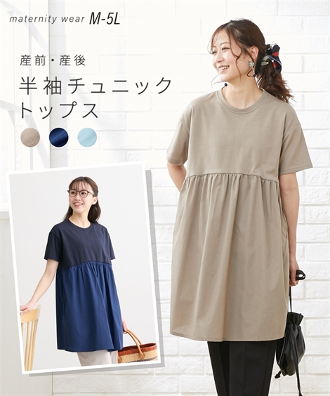 マタニティ トップス 授乳服 ママ ウエア 異素材切替 半袖 チュニック 産前 産後 産前 産後 5L ニッセン nissen