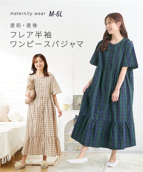 マタニティ パジャマ ルームウェア ママ ウエア 授乳服 先染め フレア袖 半袖 ワンピース 産前 産後 出産準備 3L/4L ニッセン nissen
