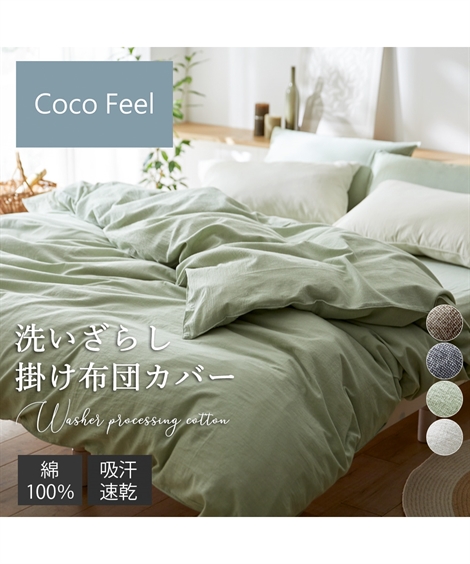 コメントこだわりの綿100%素材を使用した、洗いざらしシリーズです。まるで空気を含んでいるかのような軽やかさと、ふんわり優しい肌触りが特徴です。天然素材ならではの吸湿性・通気性もあり、一年を通して快適な睡眠をお届けします。洗いざらし加工でナチュラルな風合いとくったりとした柔らかな風合いで、リラックスした雰囲気を演出します。また染色は糸そのものから先に染めてから生地にする先染めをしているので、色落ちしにくく、深みのある独特な風合いに仕上がっております。●種類【掛け布団カバー】掛け布団カバーとは、掛け布団を包んで取り付けるカバーで、布団本体の汚れ防止や劣化を防止する目的があります。また、快適で心地よい空間にするために、お気に入りの素材デザインを見つけ季節に合わせて楽しむインテリア要素もあります。●ブランド・シリーズ【CocoFeel】ココフィールってCoco Feel 『ココフィール』は、肌触りの「ここち良さ」にトコトンこだわったニッセンの寝具を中心としたオリジナルブランドです。ここち良さに包まれて眠りたい。をコンセプトに、ここち(心地)良さ・快適(Comfortable)を感じていただける寝具を、心(こころ)を込めて。デザイン性や機能性はもちろん、肌触りの良さにこだわった寝具で眠る幸せをお届けしたい。ニッセンのCoco Feelシリーズは、お一人お一人の眠りに寄り添います。触れると幸せを感じるような快適(comfortable) さを、こころを込めてお届けします。【nissen SLEEP DRY】スリープドライって吸汗速乾生地を使用したニッセンオリジナルの商品です。 吸汗性・速乾性があるため寝汗を素早く吸い取り、速く乾くためドライで快適。吸汗性試験 (JISL1907) (ISO17617A)を実施し、自社基準をクリアした生地を使用しています。●シーズン特性・春 ・夏 ・秋 ・冬 オールシーズン快適にお使いいただけます。●色展開ミルクホワイト・フレッシュグリーン・チャコールグレー・モカベージュのお部屋馴染みの良い4色展開です。●サイズ展開シングル ダブルの2サイズ展開でご用意しています。●お手入れ方法洗濯機で丸洗い可能 気兼ねなく洗濯をすることで、いつでも清潔にお使いいただけます。冬の快眠をサポート 朝までぐっすり