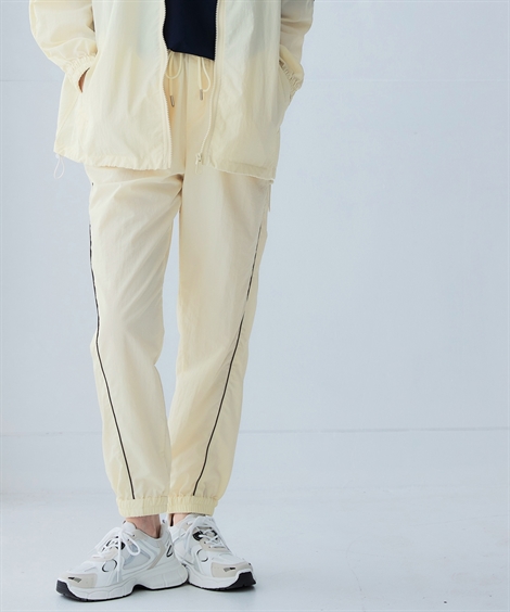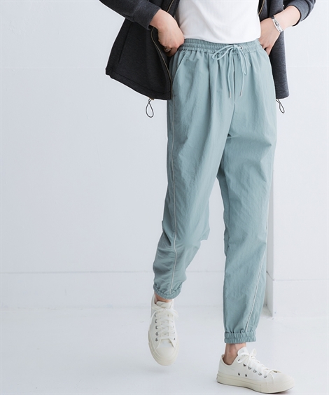 コメントスポーツラインにオリジナルのアクティブウェアが登場!アクティブなシーンだけでなく、おしゃれ着としても着用できます。■デザインナイロン素材のジョガーパンツ。パイピングデザインがおしゃれでコーデのアクセントになります。またパイピングが前に向かって施されているので視覚的な細見え効果もあります。裾口はゴム仕様なのでプッシュアップアレンジも可能。スニーカーとの相性も〇ポケットが両脇についているので便利。トレンド感のあるナイロンパンツは持っているだけでコーデ幅が広がります。細すぎず、太すぎないシルエットはカジュアルなコーデにもアクティブなコーデにも使用できます。ウエストは総ゴム仕様で簡単に着脱できます。また、外紐もついているのでサイズ調整も簡単です。■素材軽量で動きやすく、快適に着用できます。はっ水機能付きのナイロン素材なので水に濡れても安心。UVカット機能付きで日焼け対策もばっちり。ジムやスポーツなどのアクティブなシーンやリラックスシーン、街中でのタウンユースコーデとしてなど幅広く着用できます。■コーディネートセットアップで着用できます。シャツやカットソーなど異素材で組み合わせるのがトレンドです。