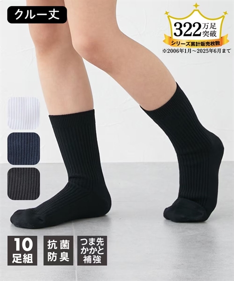 累計販売枚数313万足突破 ニッセンオリジナル 抗菌防臭 しっかり丈夫な無地クルー丈スクールソックス10足組 ●丈夫なヒミツは糸の本数!● 通常のソックスの1.3倍の特別な編立てをしています。 丈夫さに自信あり! ~その他6つのポイント~ ■抗菌防臭加工 毎日汗をかいて活発に活動してもニオイが気になりにくいです ■つま先かかと補強設計 足の負荷かかかりやすいので補強編みをしています。 ■抜群のフィット感 伸縮性があり、長時間はいても快適なはき心地です。 足口はズレにくいリブ仕様です。 ■さらりとした綿混素材 綿を使った靴下ならではのやさしいはき心地です。 通気性がよく、普段使いにもぴったりです。 ■同色10足組 洗い替えや長期の旅行や合宿にも対応できます。 ■成長に合わせて選べる4サイズ 足の大きさが16cmから26cmまで対応できるので、幼児のお子様から中高生のお子様までご着用いただけます。 一度気にいっていただけると長くご着用いただけます。 同シリーズのハイソックスも取り扱っております。