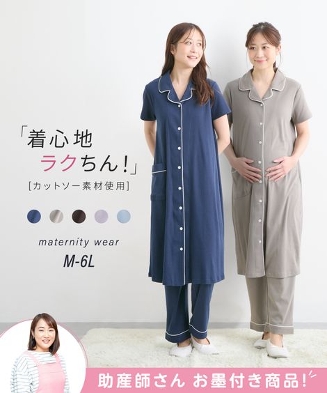 コメント衿付でキチンと感がありながら、カットソー素材でやわらかく、着心地ラクチン 長めの着丈なのでパンツなしでの着用もOKです。 前ボタン開きなので、入院時の診察にも便利。 上から2つ目、3つ目はスナップボタンなので、赤ちゃんを抱っこしたまま片手でカンタンに開けられます。 一番上のボタンは普通のボタンなので、片手でスナップボタンをはずしても全開にならず、さっと授乳口ができるのがうれしいですね。 前開き授乳タイプなので、産後、授乳期以降もパジャマとして使いやすいです。 パンツはボタン付のゴム仕様でウエスト調節が簡単にできます。 出産準備にもぜひどうぞ。 ・産前から産後に使う ・授乳機能付(前ボタン) ・パンツ:ウエスト調節可 ・夏素材