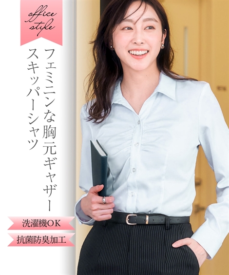 事務服 ブラウス 大きいサイズ レディース 会社制服 胸ギャザーパウダーサテンスキッパー シャツ 抗菌防臭 加工 5L/6L/8L/10L ニッセン nissen
