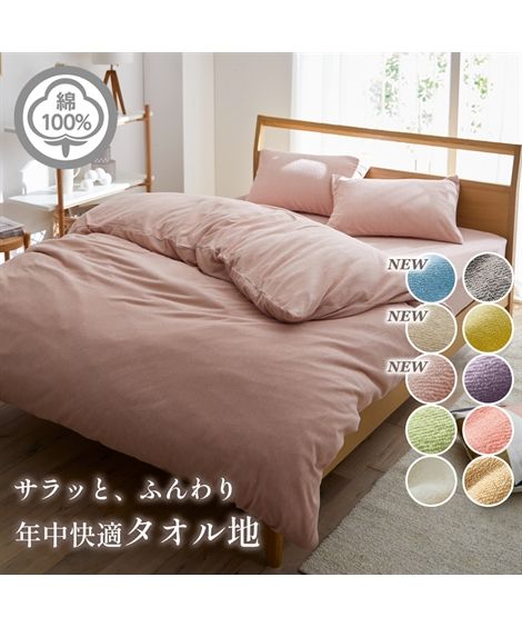 【コメント】タオル地が好き!というあなたに、お勧めの掛け布団カバーです。パイル部分は綿100%でとても気持ちが良く、多色展開なので、好きな色がきっと見つかるはず!タオル地素材は年中快適に使用できる寝具としておススメの素材です。