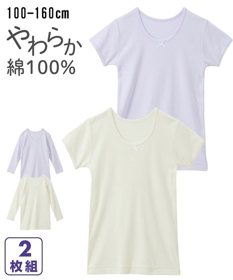 ●○●綿100%インナー2枚組●○● パステルカラーのやわらか綿100%のインナー☆彡 薄くもなく厚くもない、ちょうどいい厚さで長くお使いいただけるインナーです。 季節に応じて半袖と長袖を使い分けてもいいですね。 ■半袖、長袖が選べます 半袖(3分袖) 長袖(8分袖) ■身生地は綿100% 毎日身につけるものだから、やわらかくて肌ざわり抜群の綿100%の生地にこだわりました。 ■かわいいリボンがあり、前後が分かるインナー リボンが前身頃にあり、着るときに分かりやすいです。 ■お名前ネーム欄付 タグにお名前が書けるようになっています。 体育のお着替え、クラブや修学旅行のお着替え時の間違いや紛失の心配無し! ■セット組 毎日着用するものだから、洗い替えに便利なセット組でお届けします。 ■豊富なサイズ展開 100〜160cmの全7サイズ展開 びったりのサイズを見つけてください。