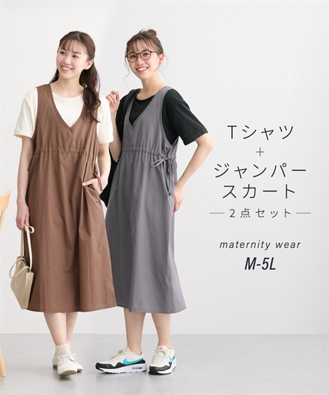 マタニティ ワンピース 授乳服 ママ ウェア 半袖 Tシャツ + ウエスト ギャザー ジャンパー スカート 2点セット 産前 産後 産前 産後 M/L ニッセン nissen