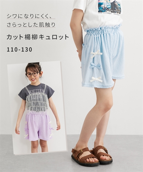 【コメント】シワになりにくく、さらっとした肌触りが魅力のカット楊柳キュロットが登場! ■デザイン ・ 楊柳特有の凹凸感のある生地が、シンプルながらも表情豊