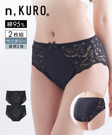 ショーツ サニタリー 生理用 レディース n KURO 綿混 ストレッチ レーシーサニタリー 昼用2枚組 羽付ナプキン対応 春 夏 秋 冬 女性 | LL/3L | ニッセン nissen