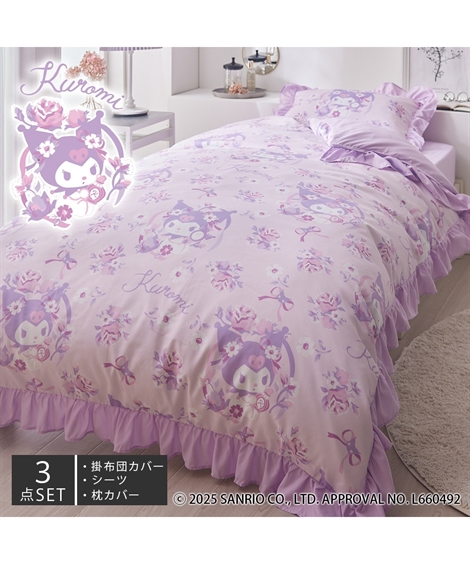 クロミの寝具カバー3点セットが登場!贅沢にフリルを施し、お部屋を大人可愛い雰囲気にします。掛け布団カバー、シーツ、枕カバーがセットになっているので、推しに囲まれながら、お部屋をまとまりのある空間にするカバーセットです。●可愛いらしいクロミ柄お花に囲まれたキュートなクロミが全面に入っており、クロミ好きにはたまらないデザイン。サンリオ推しの方にもおすすめです。●高級感のあるフリル贅沢にフリルを施し、お部屋を大人可愛い雰囲気に。●デザインが異なるリバーシブル表と裏でデザインが異なるリバーシブルなので、その日の気分に合わせて変えられます。●桃のようななめらかな肌触りピーチスキン加工を施しており、生地の表面に桃(ピーチ)のような短い毛羽をつくり、しっとりなめらかな肌触りに仕上げました。●洗濯機で洗えるいつも清潔・快適に保てます。【掛け布団カバー】●ズレ防止ヒモ6か所のズレ防止ヒモ付き。カバーの中で布団がずれないように内側にヒモが付いているのでストレスなくお使いいただけます。●長辺が全開するファスナー大きくしっかり開くので、布団の出し入れがしやすいです。【シーツ】●布団でもマットレスでも使えるお使いの布団でもマットレスでもどちらにもお使いいただけます。【枕カバー】●出し入れしやすいデザインかぶせるだけの合わせ式で、簡単に装着できます。