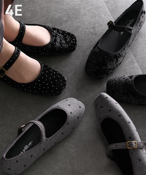 コメントシーズンムードがぐっと高まる、柄違い・色違いで揃えたいバレエシューズです。厚手でやわらかい低反発クッションの中敷きを使用しており快適な履き心地です。ストラップはお好みのサイズ感に合わせて5段階で調節が可能です。靴下やタイツと合わせても可愛く履きこなせます。■ポイント・ラインストーン付き、ハート柄、ベロア調など素材や柄違いで揃えたくなるデザイン・全面低反発クッションの中敷き仕様で優しい履き心地・お好みのサイズ感に合わせて5段階でサイズ調節が可能なストラップ・ローヒールでシーンを選ばず履きやすい・甲高、幅広、ふっくら足さんなど、足のお悩みをお持ちの方に心地よく履いていただける設計■ニッセンオリジナルの大きいサイズ規格本当に合う靴に出会った事はありますかニッセンの4Eは、靴底の幅を広げ、甲や足首周りもゆったりの独自設計。靴のサイズにお悩みのお客様へ向けて、サイズが大きくてもバランス良くきれいに見えるよう企画したオリジナルシューズです。