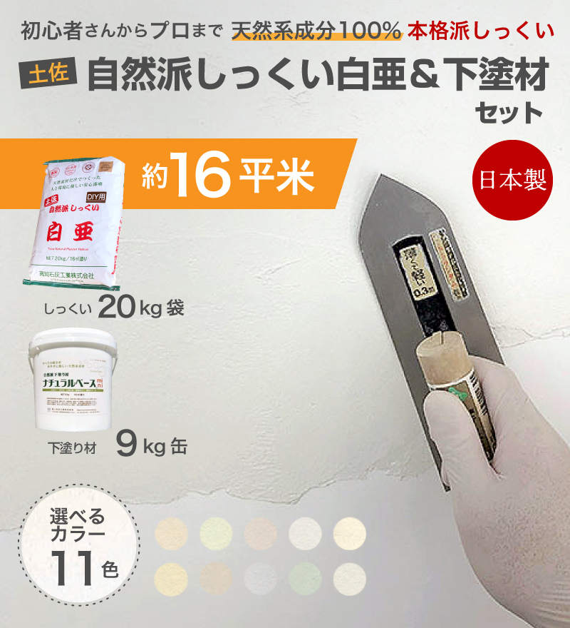 土佐自然派しっくい白亜 DIY用&下塗りセット 高知石灰工業 下塗り材と上塗り材(漆喰)のセット 専用カラー付 家庭用 天然素材100%