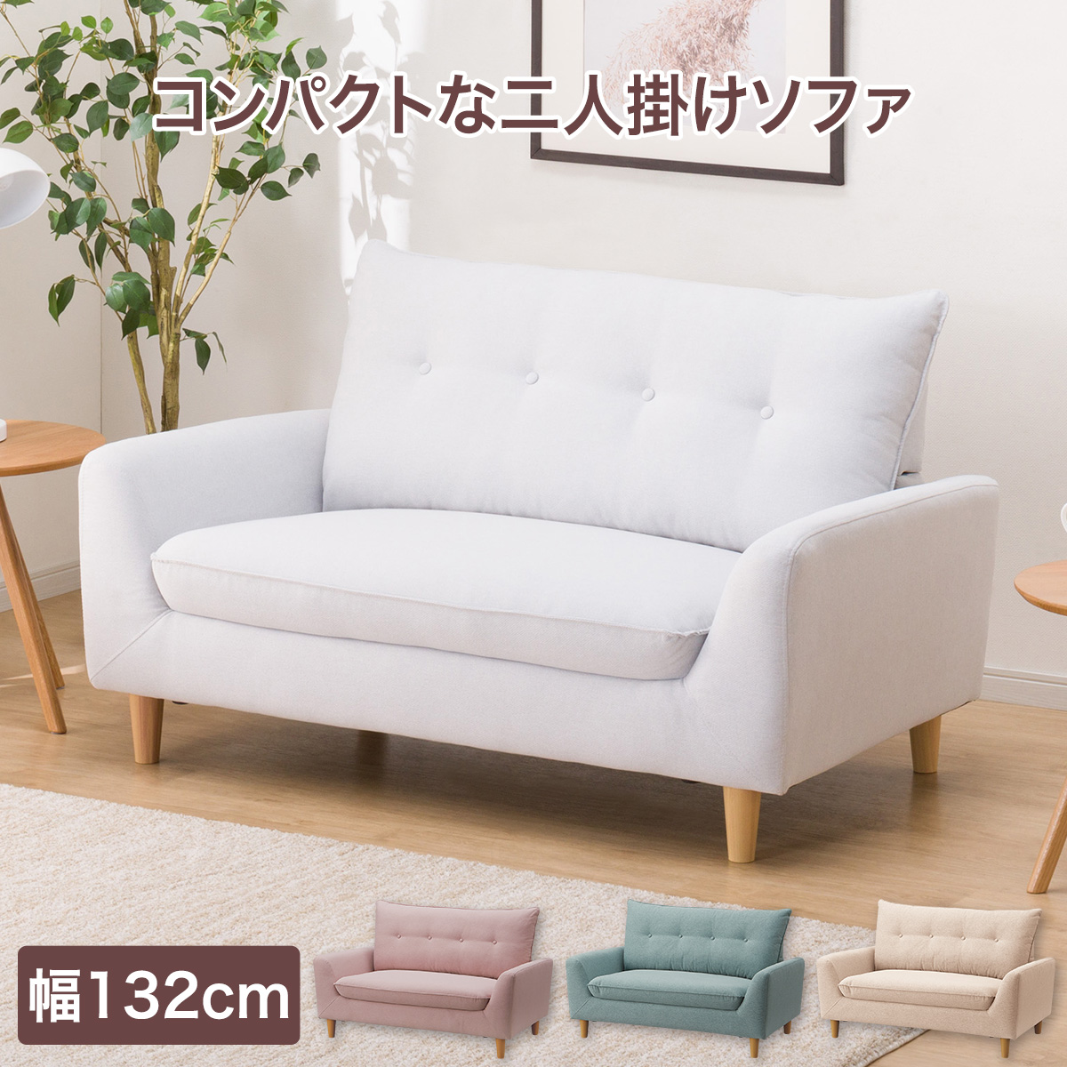 背もたれの幅広クッションが可愛いらしいコンパクトな2人用ソファ。