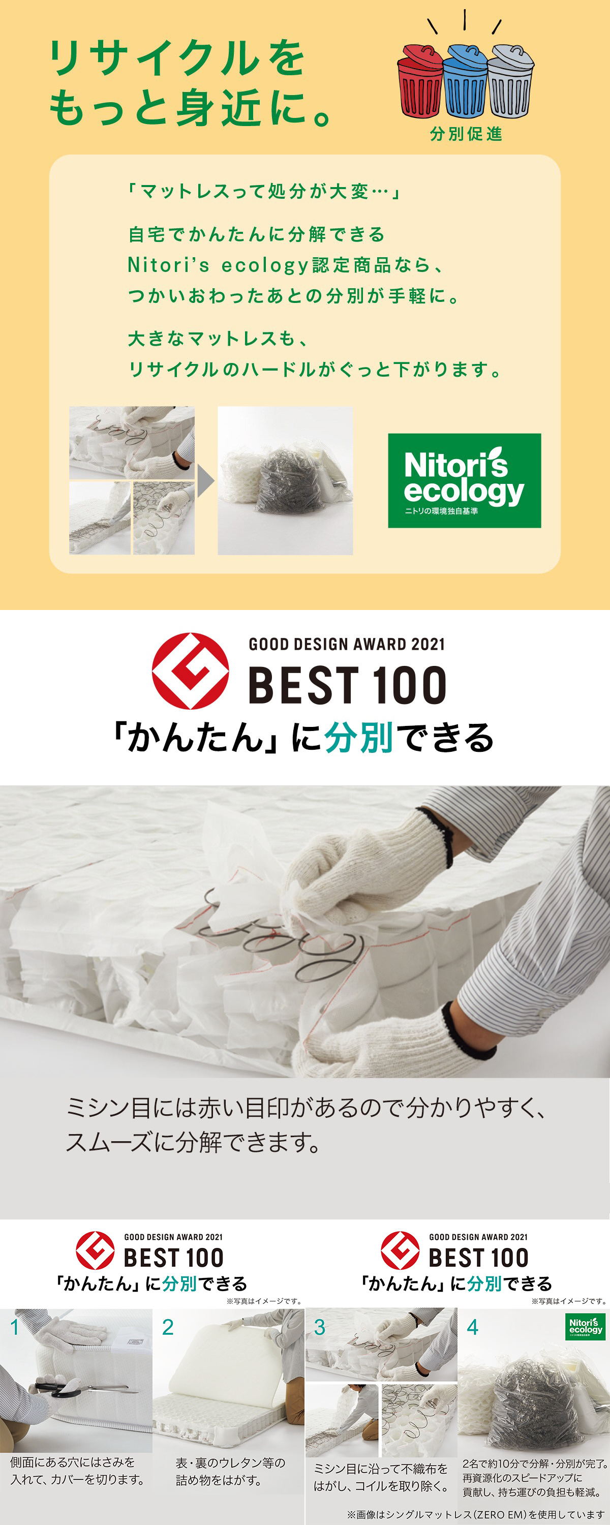 処分時に分解しやすい「かんたん分別」マットレス。