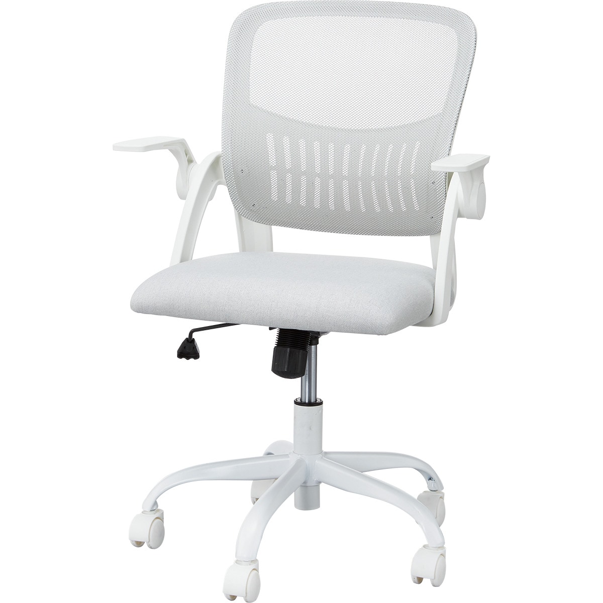 跳ね上げ式の肘付き回転チェアです。