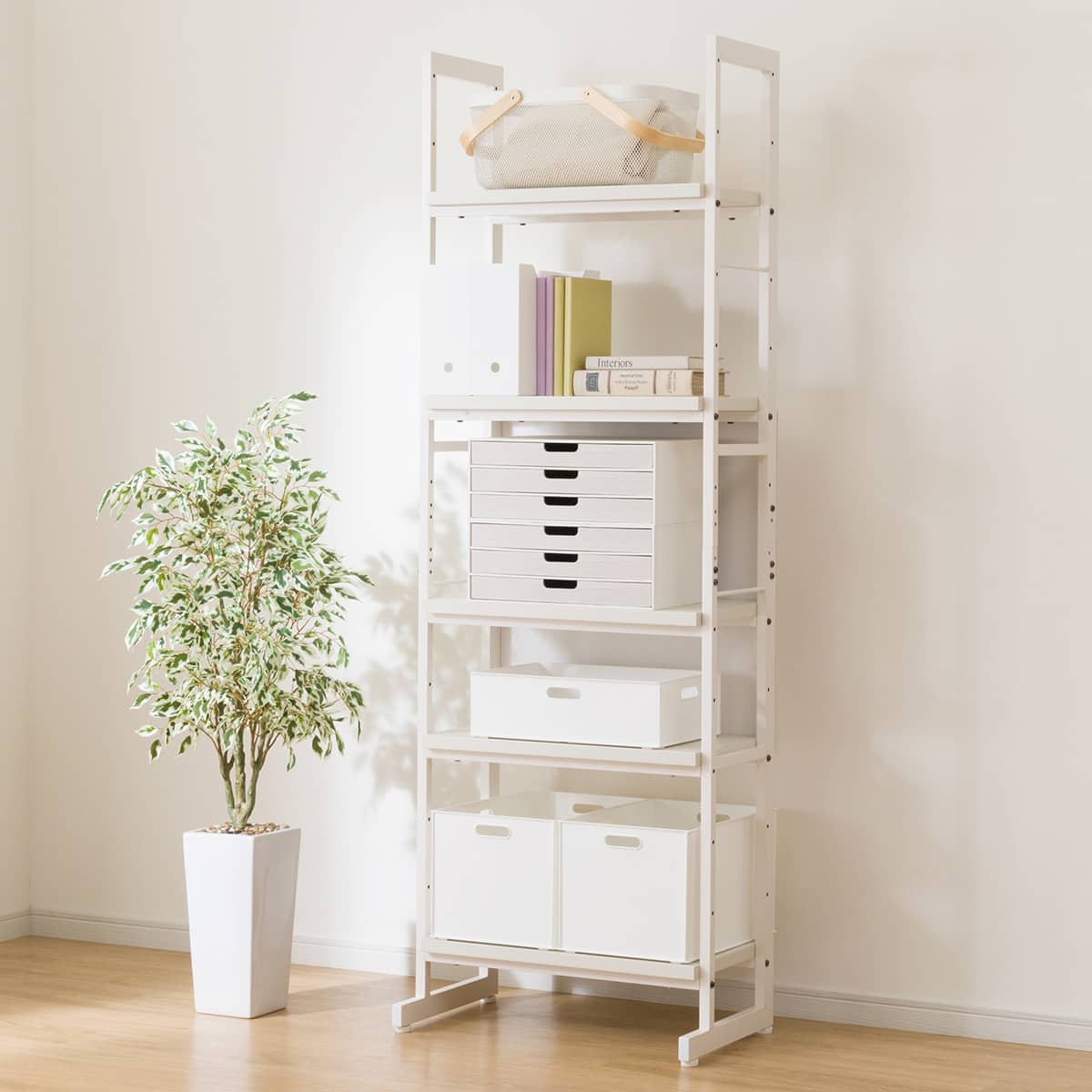 高さのある設計で効率的に収納スペースを確保しながらも、オープンスタイルのため圧迫感を感じにくいのが魅力です。JH01シリーズのシェルフデスクの拡張収納としても活用でき、リビングやオフィスなど幅広い空間に馴染みやすいデザインです。見せる収納としてもお使いいただけます。