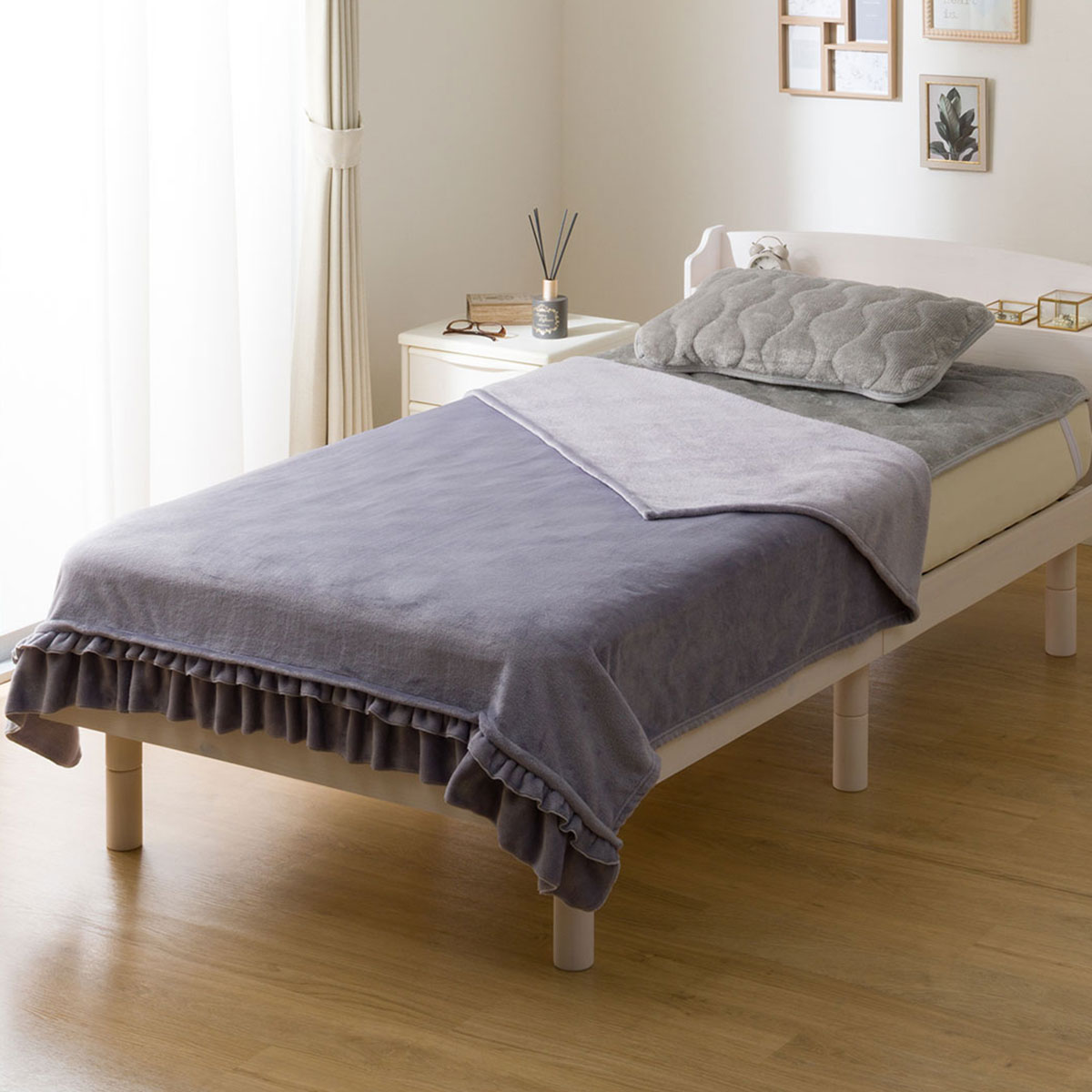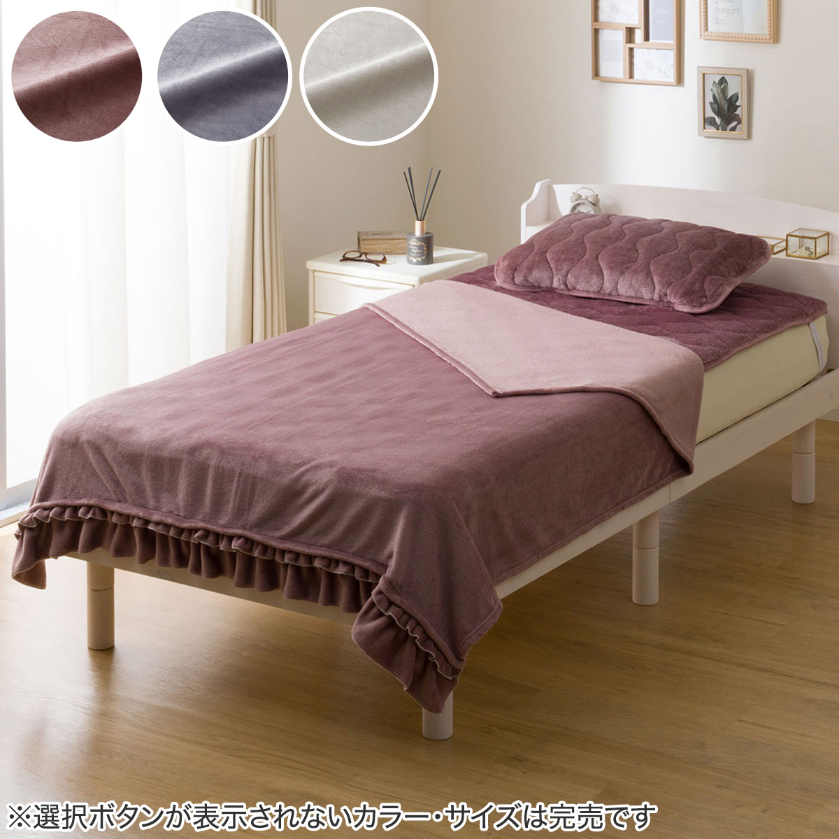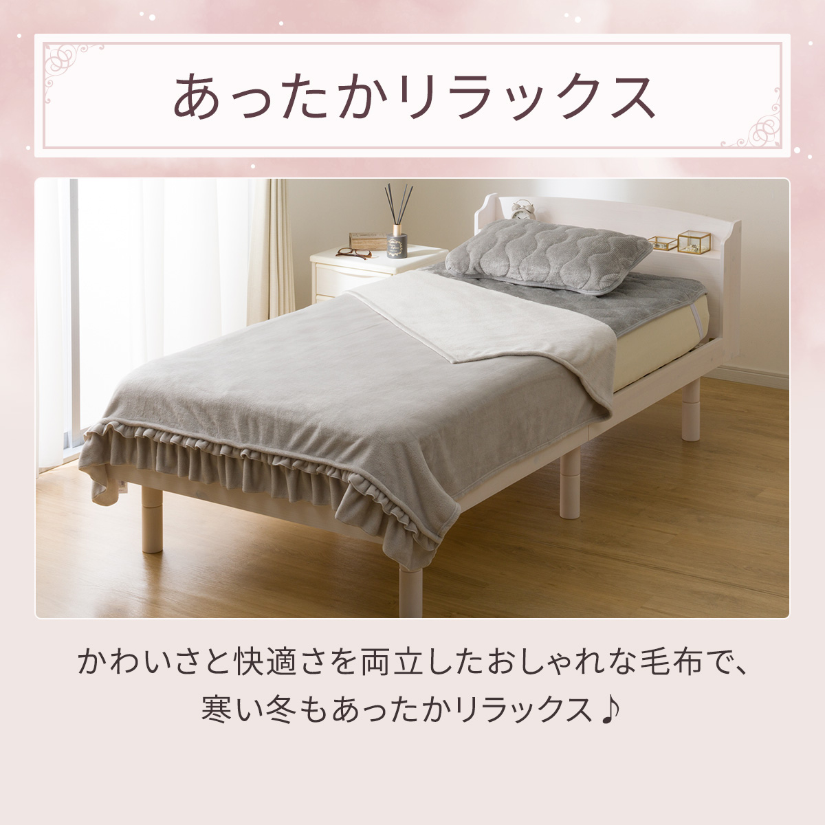 ●なめらかな肌ざわりのフリル付き毛布です。