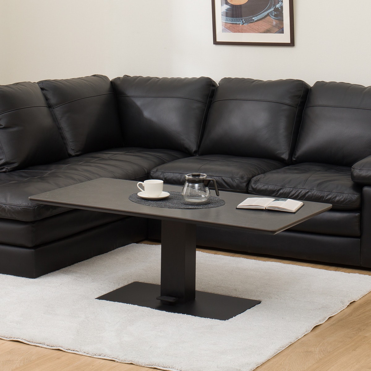 天板に美しく強いセラミック素材を使用した昇降テーブル。シンプルでモダンなデザイン。ペダルでお好みの高さに調整できます。