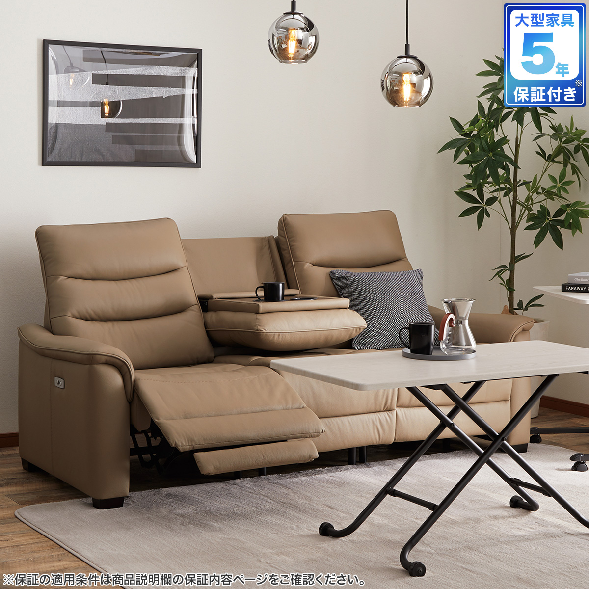 「3人用テーブル付きソファ」は中央の座席を倒すとテーブルになり、飲み物やちょっとした小物を置くのに便利です。