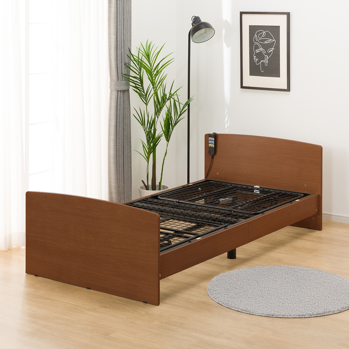 木目調の落ち着いた雰囲気のモダンな電動ベッドです。