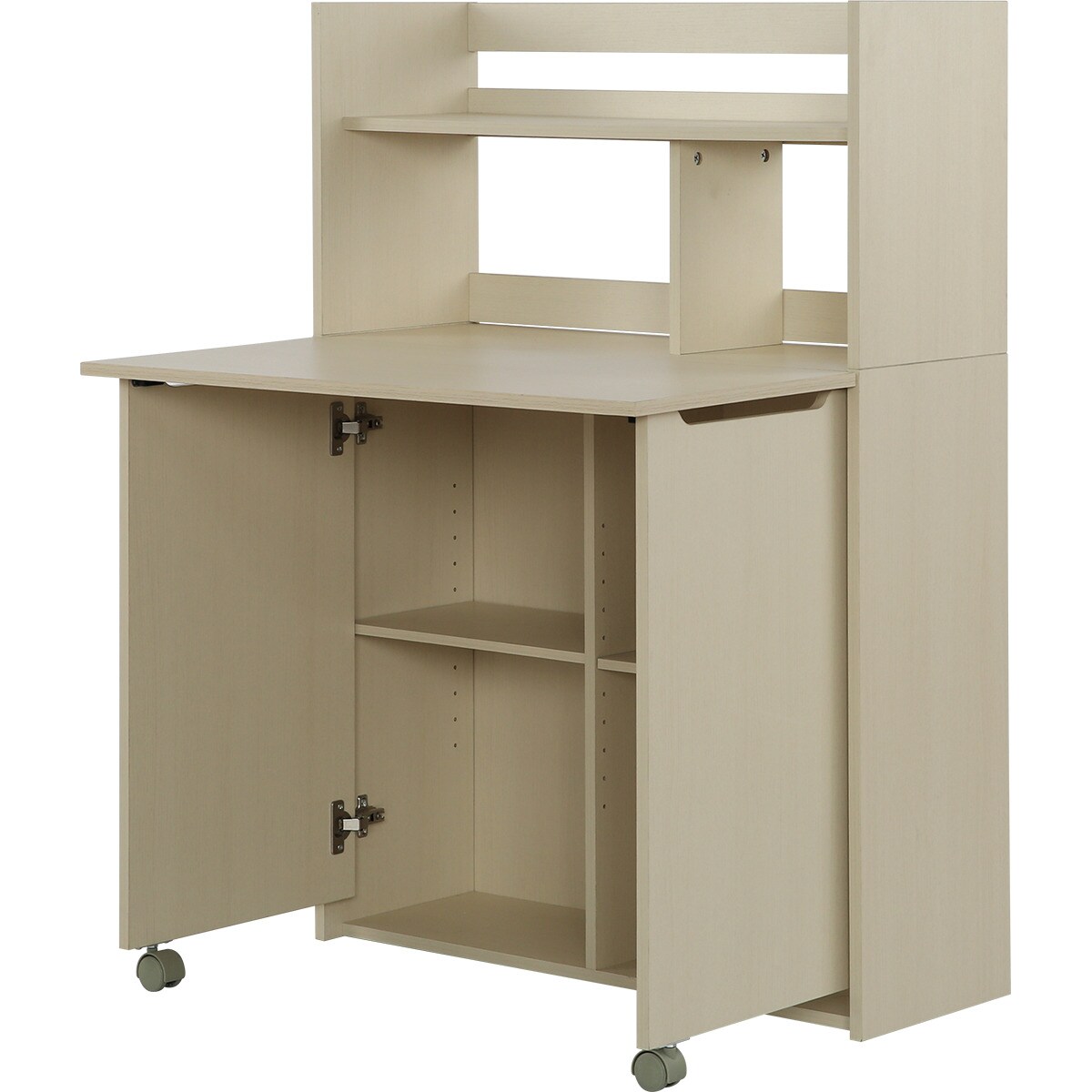 普段は収納家具として、天板を開けば簡易デスクとして使える机とラックが一体化した2WAYデザイン。限られたスペースの有効活用が可能です。