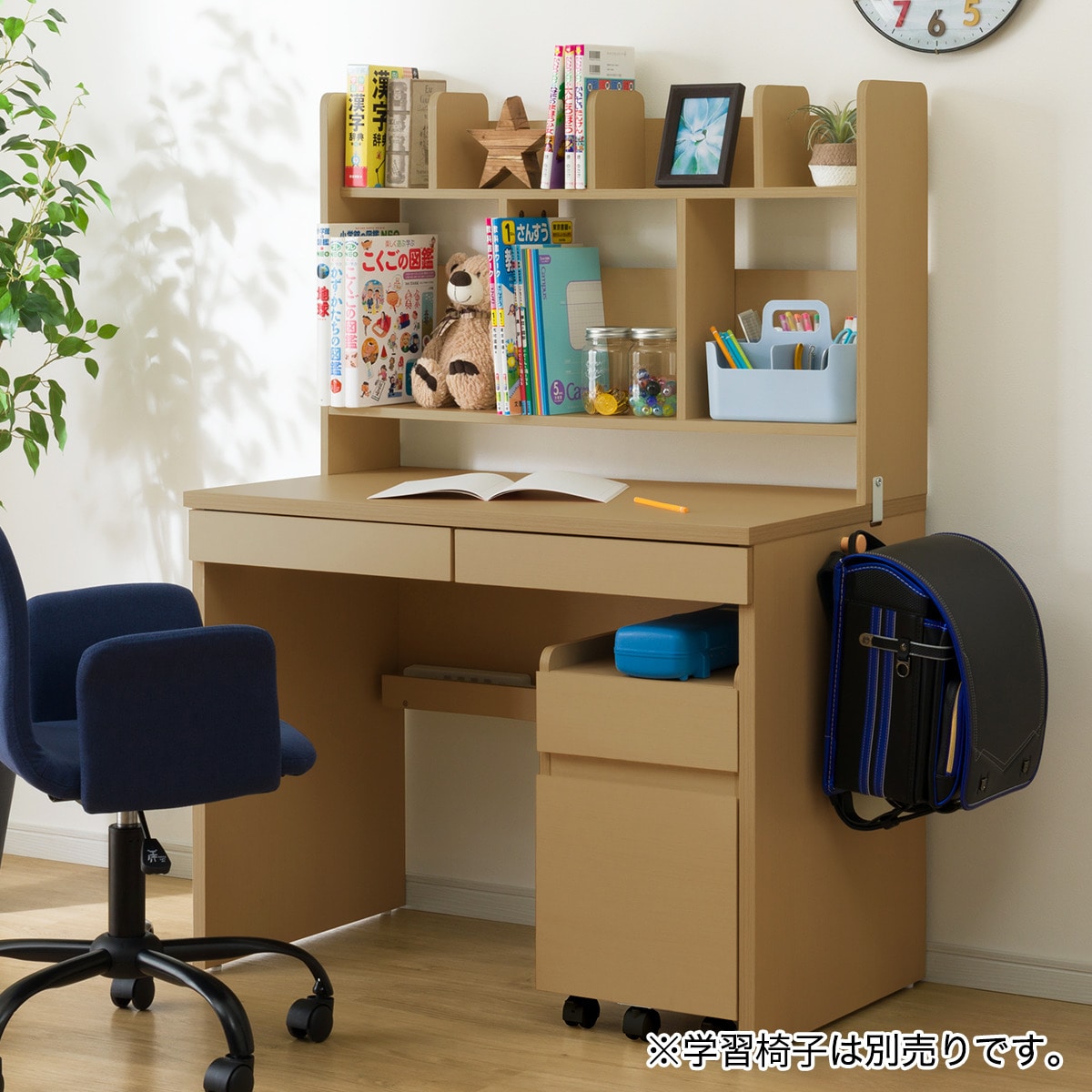デスクには2杯の引出し、さらにデスク周りの小物、文房具、本など整理整頓でき、お気に入りのぬいぐるみをおいたりできる大容量収納の本棚付き。さらにデスク側面には通学鞄などを掛けられるフック付きです。