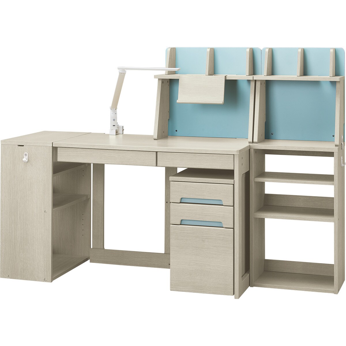 ワゴンは隠しキャスター仕様で見た目もすっきり。3段の引出しはフルスライドレールを採用し、奥に収納したものまで簡単に取り出せます。調光式のLEDデスクライト付きで、明るさを調節しながら快適に学習や作業ができるのもポイントです。