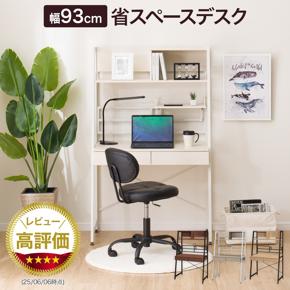 単品デスクの大きさで上棚、天板奥を収納スペースとして使え、場所を取りません。
