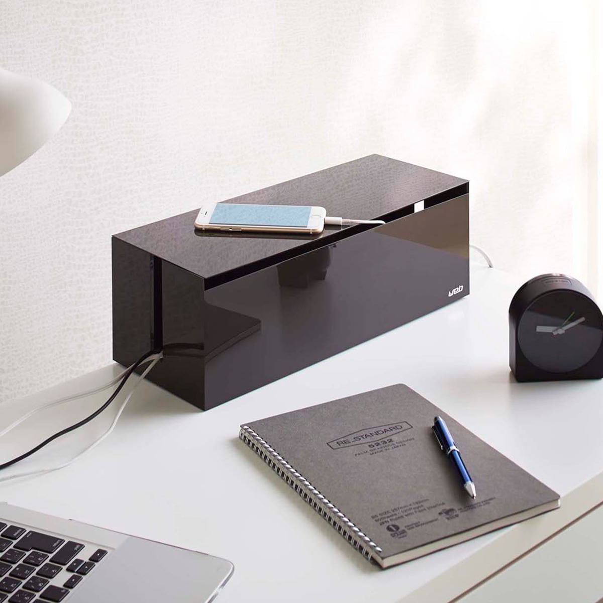 ●蓋の上でデジタル機器が充電しやすい、正面の配線口。