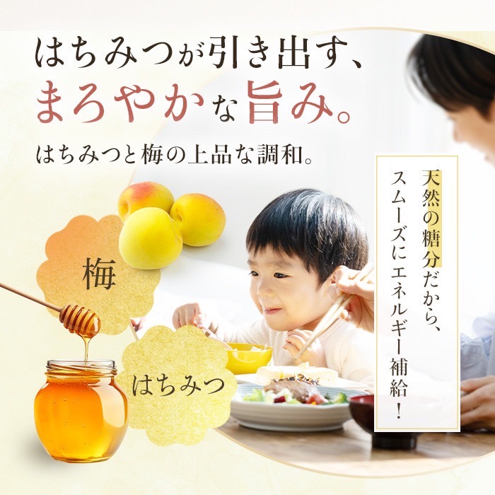 〇人口甘味料・保存料不使用はちみつ梅塩分5%:梅(和歌山県産)、漬け原材料(醸造酢、果糖ブドウ糖液糖、砂糖、食塩、梅酢、はちみつ)